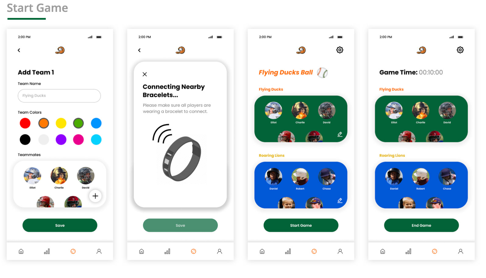 Here displays the UI comps of how users would start a game with the data-tracking baseball by pairing it with the app. Users would then divide themselves into teams by pairing their digital bracelets. When users begin playing a game, they can view live stats. After playing the game, users can share their highlights and achievements to Quaker Jack through the app.